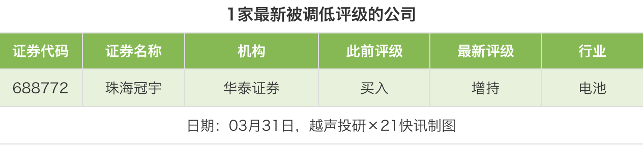 评级调低方面,3月31日,券商调低上市公司评级1家次,华泰证券对珠海冠宇的评级从“买入”调低至“增持”。