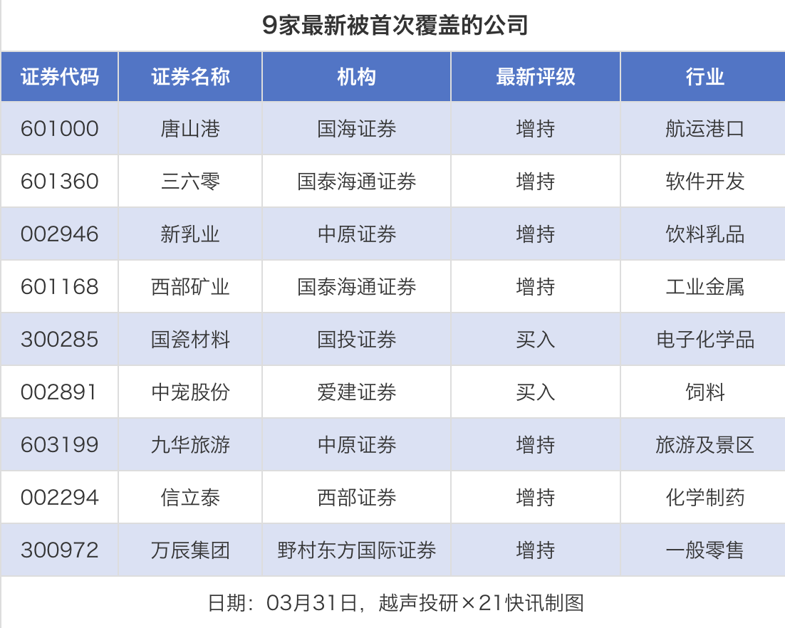 首次覆盖方面,3月31日券商共给出了9次首次覆盖,其中唐山港获得国海证券给予“增持”评级,三六零、西部矿业获得国泰海通证券给予“增持”评级,新乳业获得中原证券给予“增持”评级,国瓷材料获得国投证券给予“买入”评级。