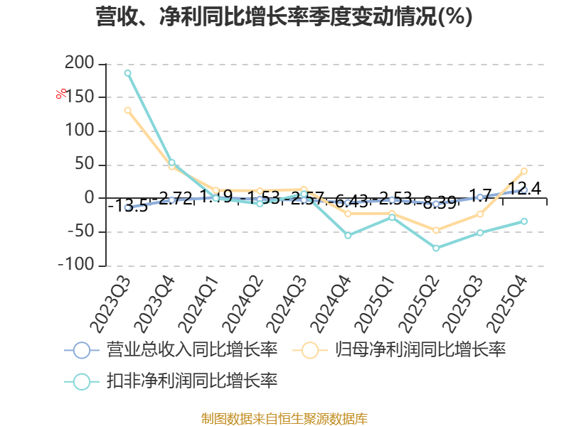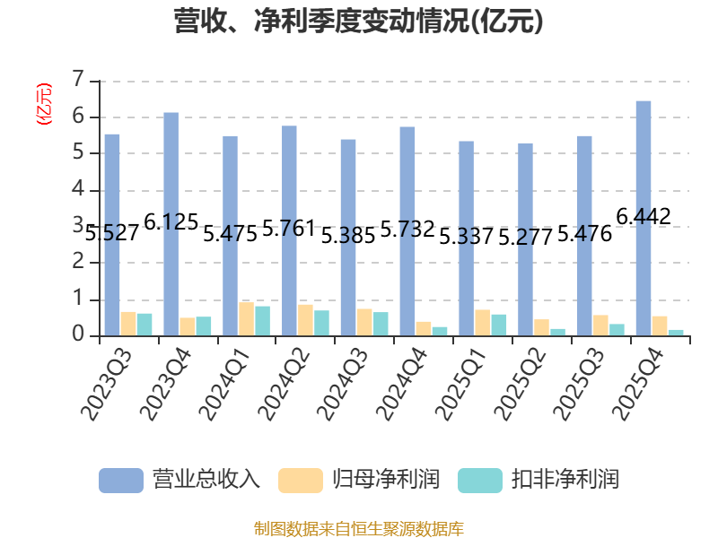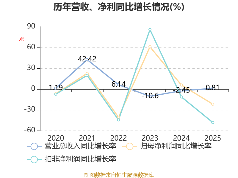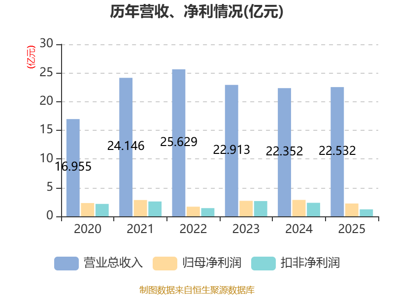 中证智能财讯荣晟环保(603165)4月1日披露2025年年度报告。2025年,公司实现营业总收入22.53亿元,同比增长0.81%;归母净利润2.24亿元,同比下降21.86%;扣非净利润1.22亿元,同比下降48.39%;经营活动产生的现金流量净额为-5.6亿元,上年同期为1.11亿元;报告期内,荣晟环保基本每股收益为0.86元,加权平均净资产收益率为9.90%。公司2025年度分配预案为:拟向全体股东每10股派现11元(含税)。