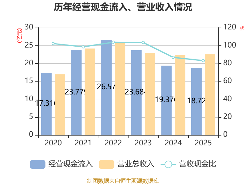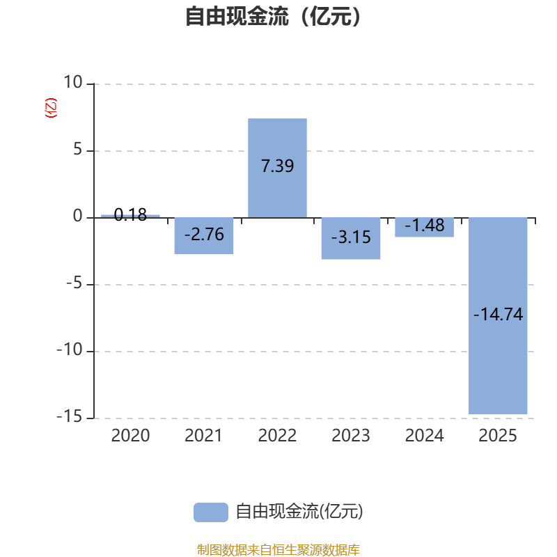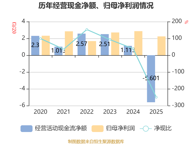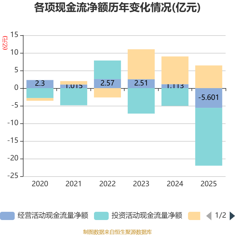截至2025年,公司经营活动现金流净额为-5.6亿元,同比减少6.71亿元;筹资活动现金流净额6.44亿元,同比减少1.44亿元;投资活动现金流净额-16.39亿元,上年同期为-5.02亿元。