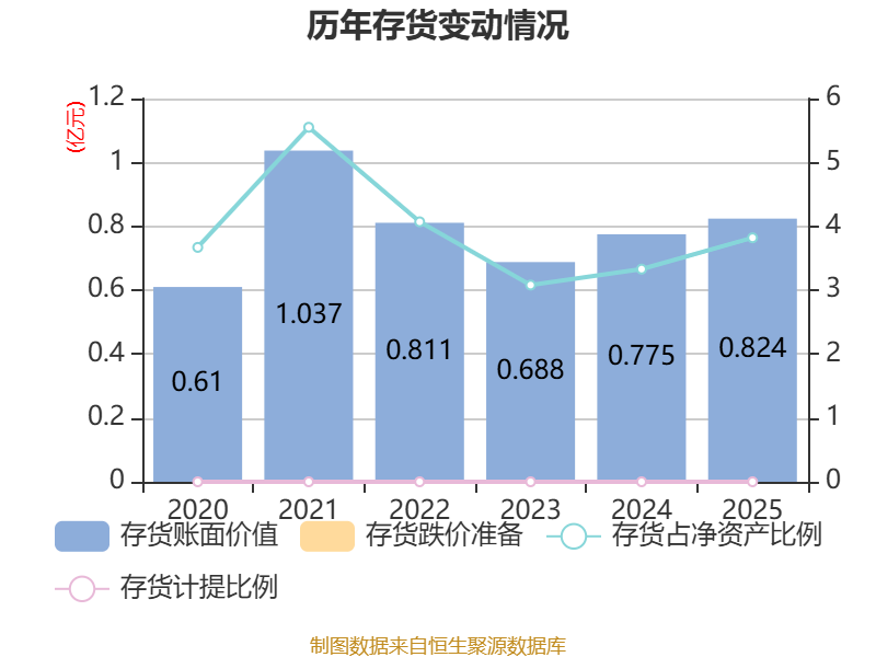 从存货变动来看,截至2025年末,公司存货账面价值为8238.09万元,占净资产的3.82%,较上年末增加484.19万元。公司本期没有计提存货跌价准备。