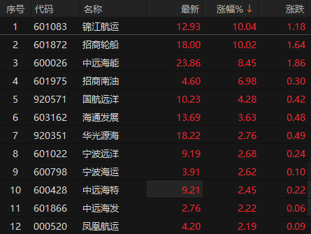 上证报中国证券网讯 4月1日早盘,航运板块拉升,截至9时38分,招商轮船、锦江航运涨停,中远海能涨超8%,招商南油、宁波远洋等跟涨。