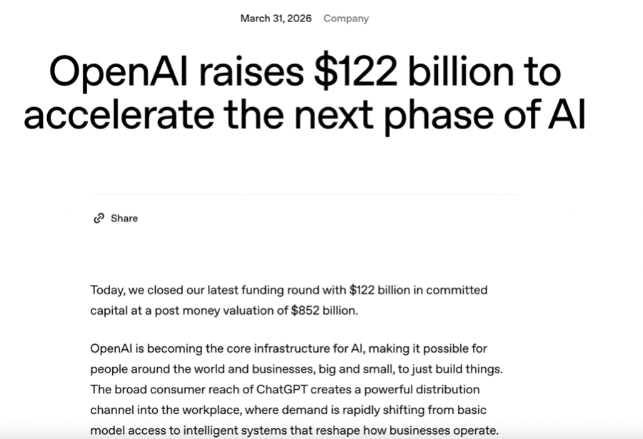 Open AI宣布于当地时间3月31日完成新一轮融资,募集资金1220亿美元,投后估值达8520亿美元。据称,OpenAI是用户数量最快突破1000万的技术平台,也是最快突破1亿的技术平台,很快将成为最快突破10亿周活跃用户的平台。ChatGPT发布一年内,公司营收达到10亿美元。到2024年底,Open AI季度营收达10亿美元。如今,公司月营收已达20亿美元。在这个阶段,Open AI的营收增长速度是那些定义了互联网和移动时代的公司(包括Alphabet和Meta)的四倍。本轮融资由Open AI战略合作伙伴亚马逊、英伟达和软银领投,长期合作伙伴微软继续参与其中。