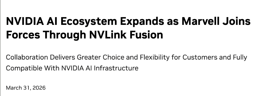 NVIDIA(英伟达)和Marvell宣布建立战略合作伙伴关系,通过NVIDIA NVLink Fusion将Marvell连接到NVIDIA AI Factory和AI-RAN生态系统,为基于NVIDIA架构的客户在开发下一代基础设施时提供更大的选择和灵活性。Marvell将提供定制的XPU和与NVLink Fusion兼容的纵向扩展网络,而NVIDIA将提供支持技术,包括Vera CPU、ConnectX网卡、Bluefield DPU、NVLink互连和Spectrum-X交换机,以及机架级AI计算能力。此外,英伟达还向Marvell投资了20亿美元。两家公司还将合作,利用NVIDIA Aerial AI-RAN for 5G/6G将全球电信网络转变为AI基础设施,并推进世界一流的AI网络,包括先进的光互连解决方案和硅光子技术。