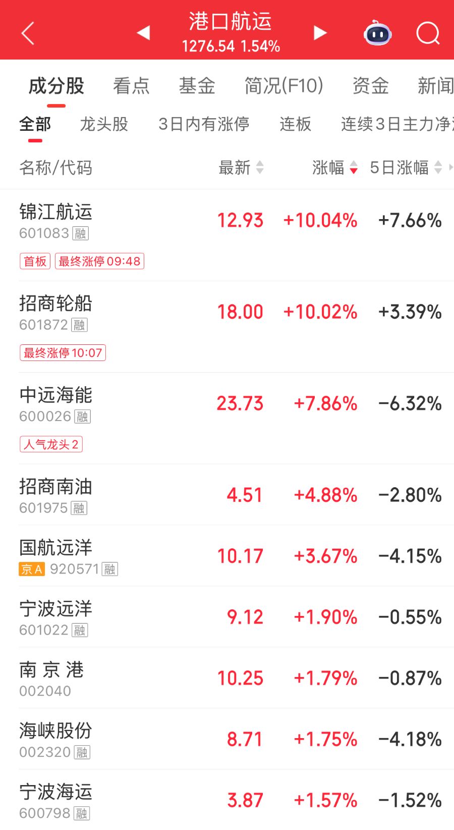 4月1日早盘,港口航运板块异动拉升,锦江航运、千亿市值龙头招商轮船双双涨停,中远海能、招商南油、国航远洋、中远海特跟涨。