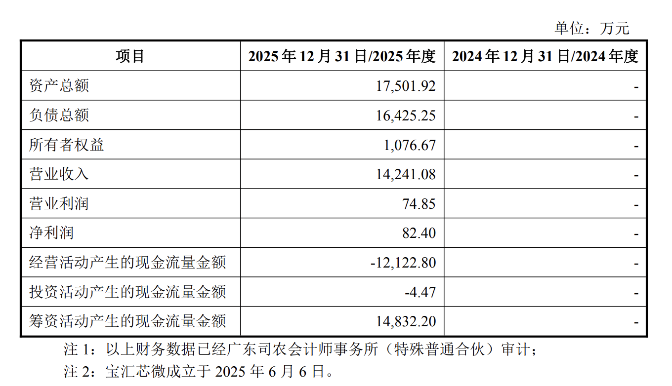 财务数据显示,截至去年年末,宝汇芯微资产总额为1.75亿元,负债总额为1.64亿元,全年营收为1.42亿元,净利润82.40万元。