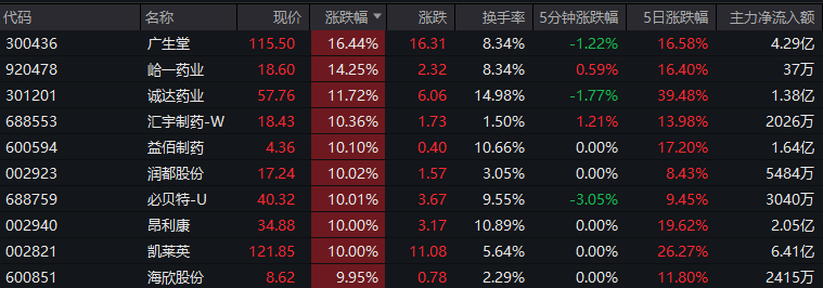 此外,睿智医药20%涨停,毕得医药、艾迪药业、益方生物、广生堂、诚达药业、必贝特、西点药业、百利天恒等涨超10%,益佰制药、润都股份、昂利康、海欣股份等涨停。
