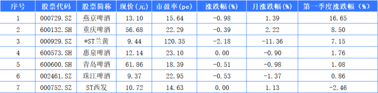 1家下跌,为ST西发-2.46%,居第一季度啤酒涨幅末位。