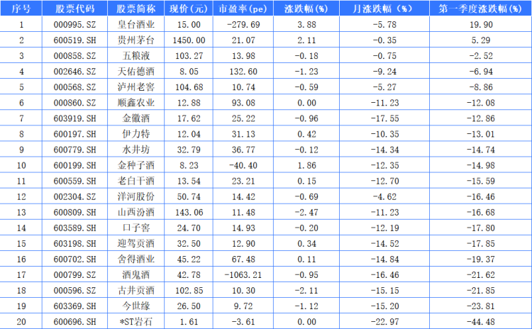 头部白酒企业郎酒股份未上市,其他白酒头部A股,山西汾酒、洋河股份、古井贡酒今年第一季度涨幅为-16.46%、-21.85%。