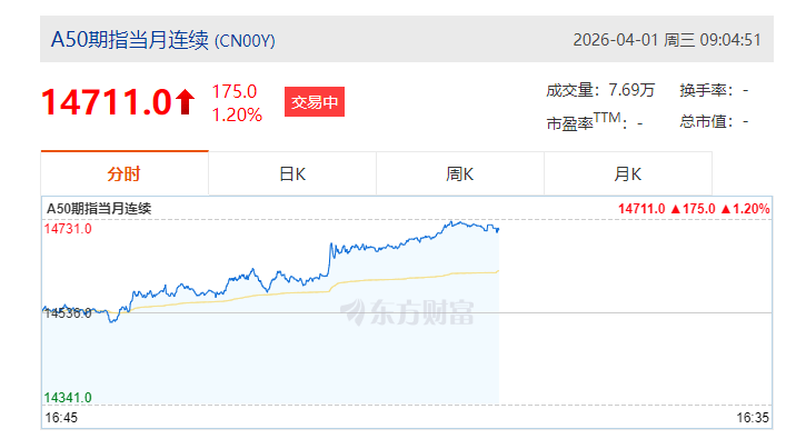 上证报中国证券网讯 4月1日,富时中国A50指数期货在上一个交易日夜盘收涨1.23%的基础上高开,截至9时04分,主力合约涨1.2%。