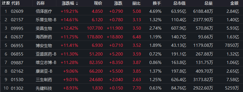 港股医疗保健业大涨,佰泽医疗涨超19%,乐普生物-B、荣昌生物、海西心意、保安生物、亚盛医药-B、维立志博-B等涨超10%。
