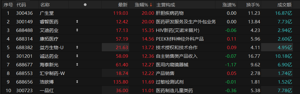 A股方面,广生堂、睿智生物“20cm”涨停,艾迪药业、康拓医疗、益方生物-U、诚达药业、海泰新光、汇宇制药-W等跟涨。