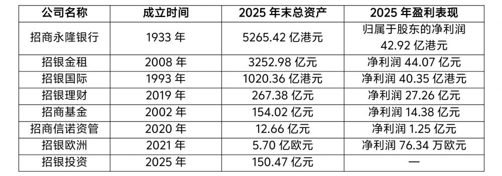 “主要子公司”的统计范围指的是招商永隆银行、招银国际、招银金租、招商基金、招银理财、招银欧洲、招商信诺资管和招银投资等8家公司。具体如下: