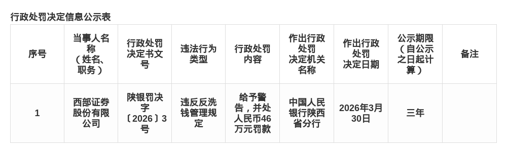 西部证券被罚46万,涉违反反洗钱管理规定