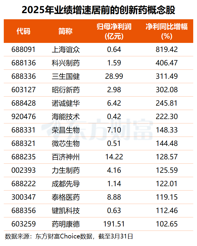 具体而言,恒瑞医药2025年创新药收入达163.42亿元,同比增长26.09%,占药品销售收入比重达58.34%;诺诚健华、百济神州、云顶新耀等企业2025年均首次实现盈利;药明康德、三生国建、科兴制药、泰格医药、力生制药等十余股净利增幅均在100%以上。