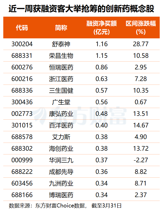 东方财富Choice数据显示,近一周多达59只创新药概念股获得融资净买入,舒泰神、荣昌生物均获杠杆资金加仓逾1.1亿元,恒瑞医药获融资客抢筹8558万元,浙江医药、三生国健、广生堂融资净买额均在5000万元以上。
