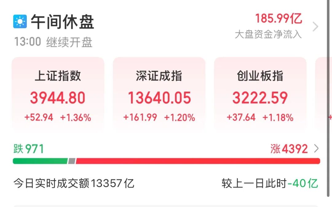 4月1日早盘,A股主要指数集体反弹,科创综指盘中一度涨超3%。截至午间收盘,上证指数报3944.80点,涨1.36%;深证成指涨1.20%,创业板指涨1.18%,科创综指涨2.79%。沪深北三市半日成交13357亿元,与上个交易日同期几乎持平。