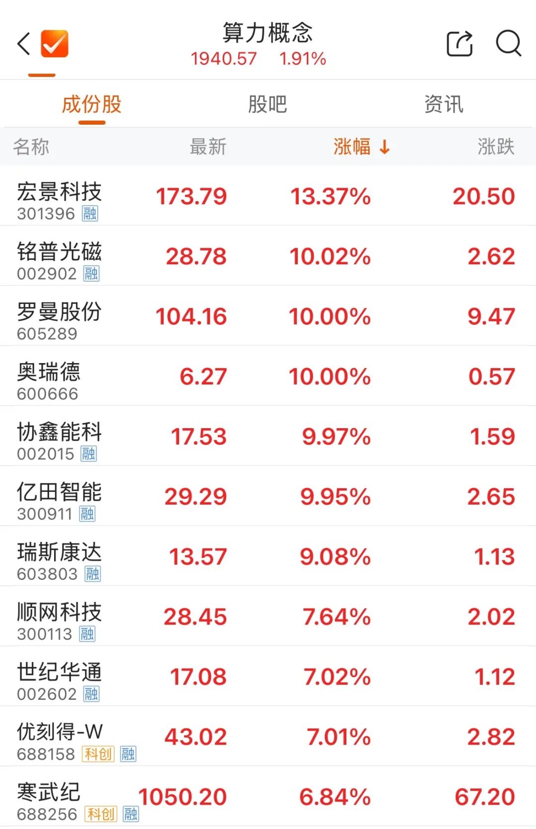 盘初,算力产业链集体上涨,存储芯片概念表现活跃。截至午间收盘,宏景科技涨超10%,铭普光磁、奥瑞德等个股涨停,寒武纪涨近7%。