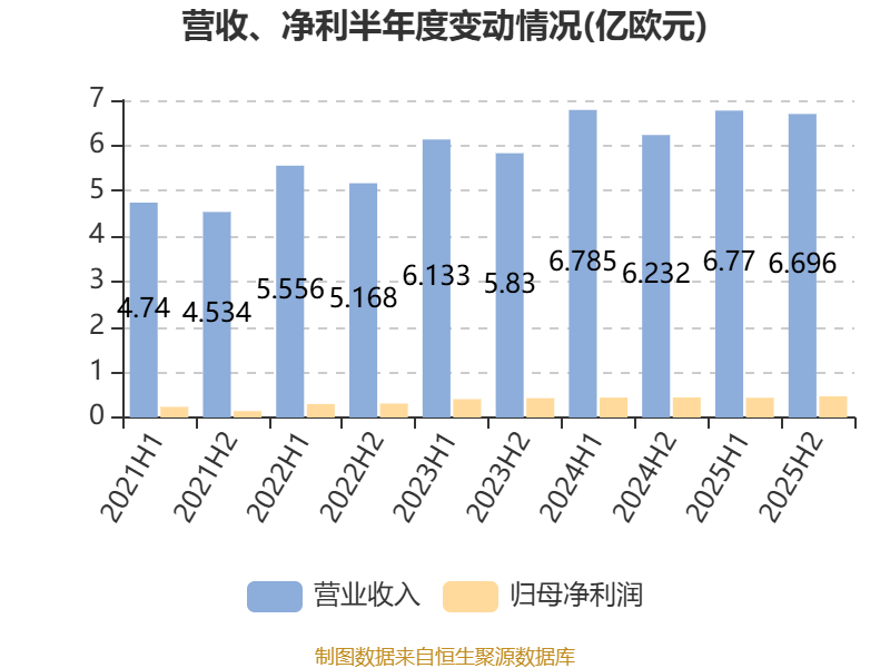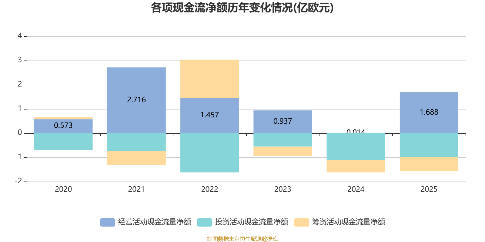 2025年,公司经营活动现金流净额为1.69亿欧元,同比增长11916.23%;筹资活动现金流净额-5979.2万欧元,同比减少905.7万欧元;投资活动现金流净额-9790.9万欧元,上年同期为-1.12亿欧元。