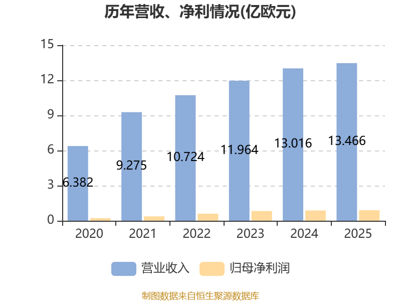 中证智能财讯法拉帝(09638)3月31日披露2025年度报告。报告期内,公司实现营业收入13.47亿欧元,同比增长3.45%;归母净利润9000.7万欧元,同比增长2.38%;经营活动产生的现金流量净额为1.69亿欧元,同比增长11916.23%;据报告显示,法拉帝基本每股收益为0.27欧元,平均净资产收益率为10.35%。