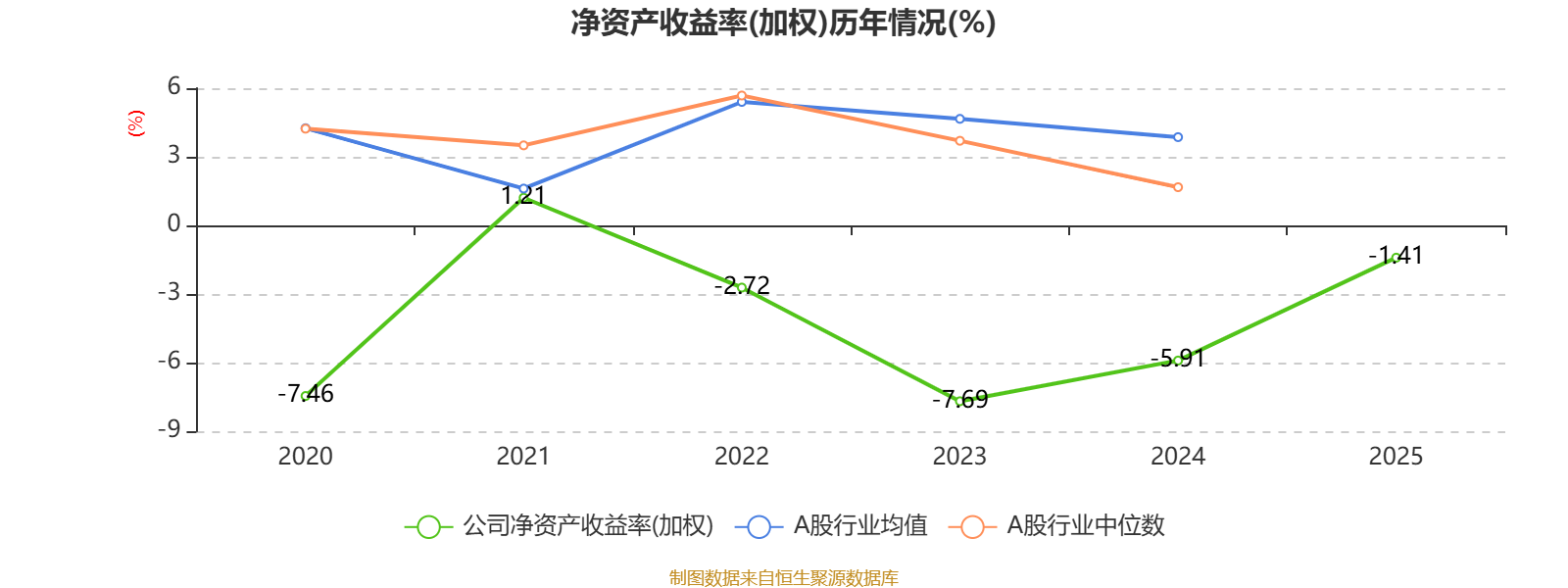 数据显示,2025年公司平均净资产收益率为-1.41%,较上年同期上升4.5个百分点。