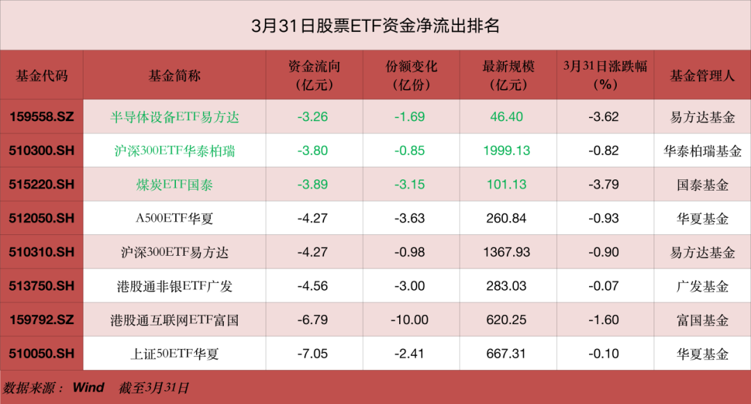 【导读】3月31日股票ETF市场净流入资金超30亿元,各类宽基和港股ETF资金流向分化明显