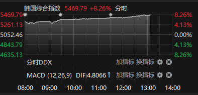 4月1日,韩国综合指数持续走强,截至北京时间13时08分,指数涨逾8%。
