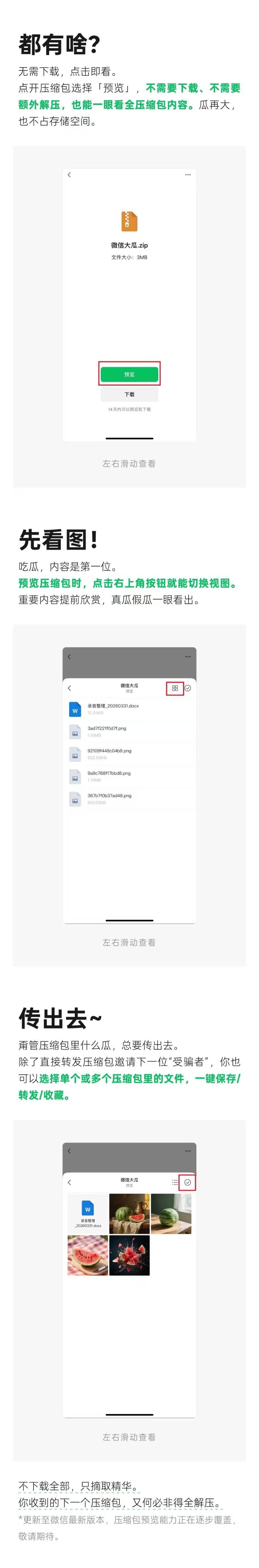 日前,微信派介绍了微信的新功能:微信支持压缩包直接预览了。无需下载,点击即看。