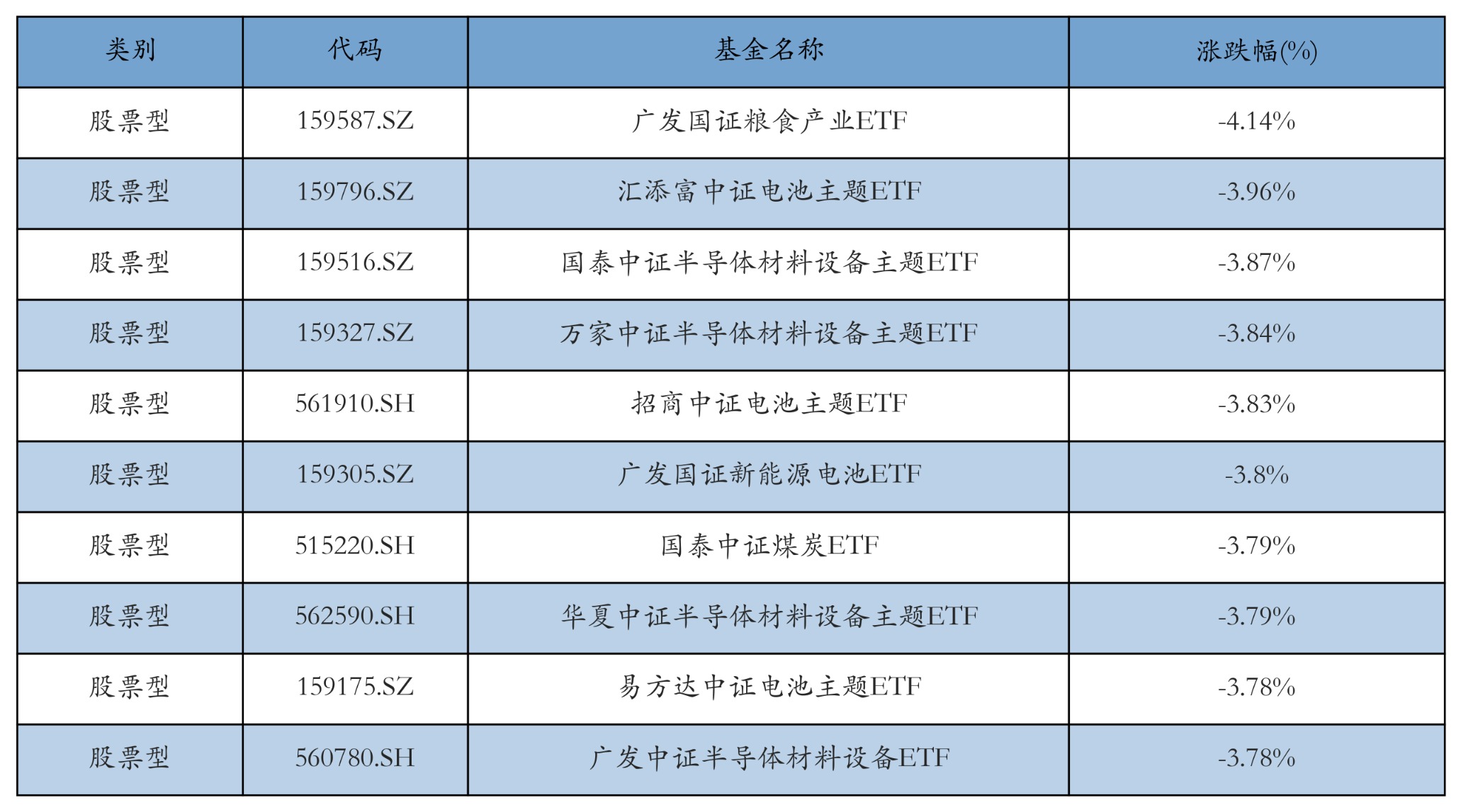昨日股票型ETF跌幅最大的3只ETF及其收益率分别为:广发国证粮食产业ETF(-4.14%)、汇添富中证电池主题ETF(-3.96%)、国泰中证半导体材料设备主题ETF(-3.87%)。跌幅前10详情见下表: