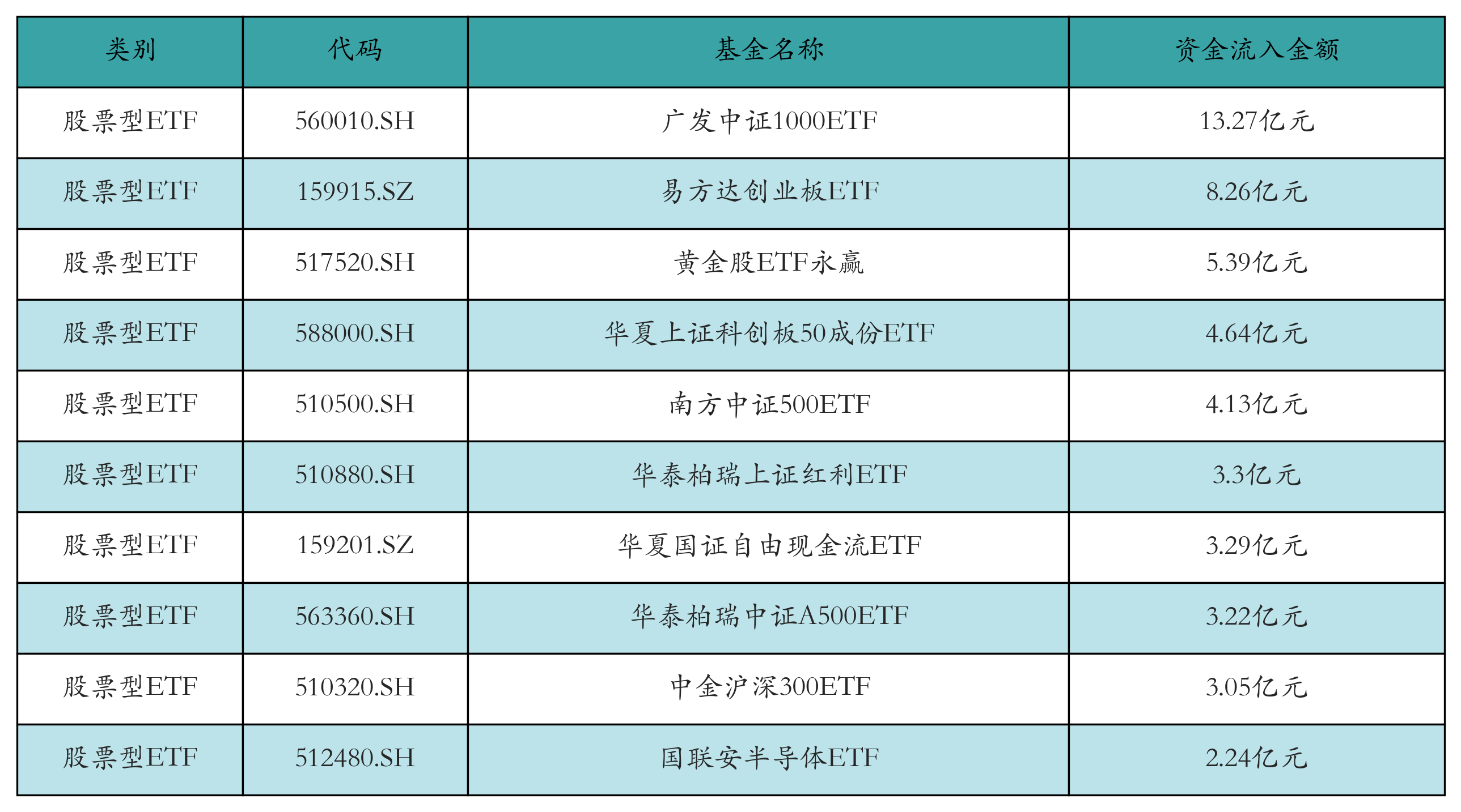昨日股票型ETF资金流入最多的3只ETF及其流入金额分别为:广发中证1000ETF(流入13.27亿元)、易方达创业板ETF(流入8.26亿元)、黄金股ETF永赢(流入5.39亿元)。资金流入前10详情见下表: