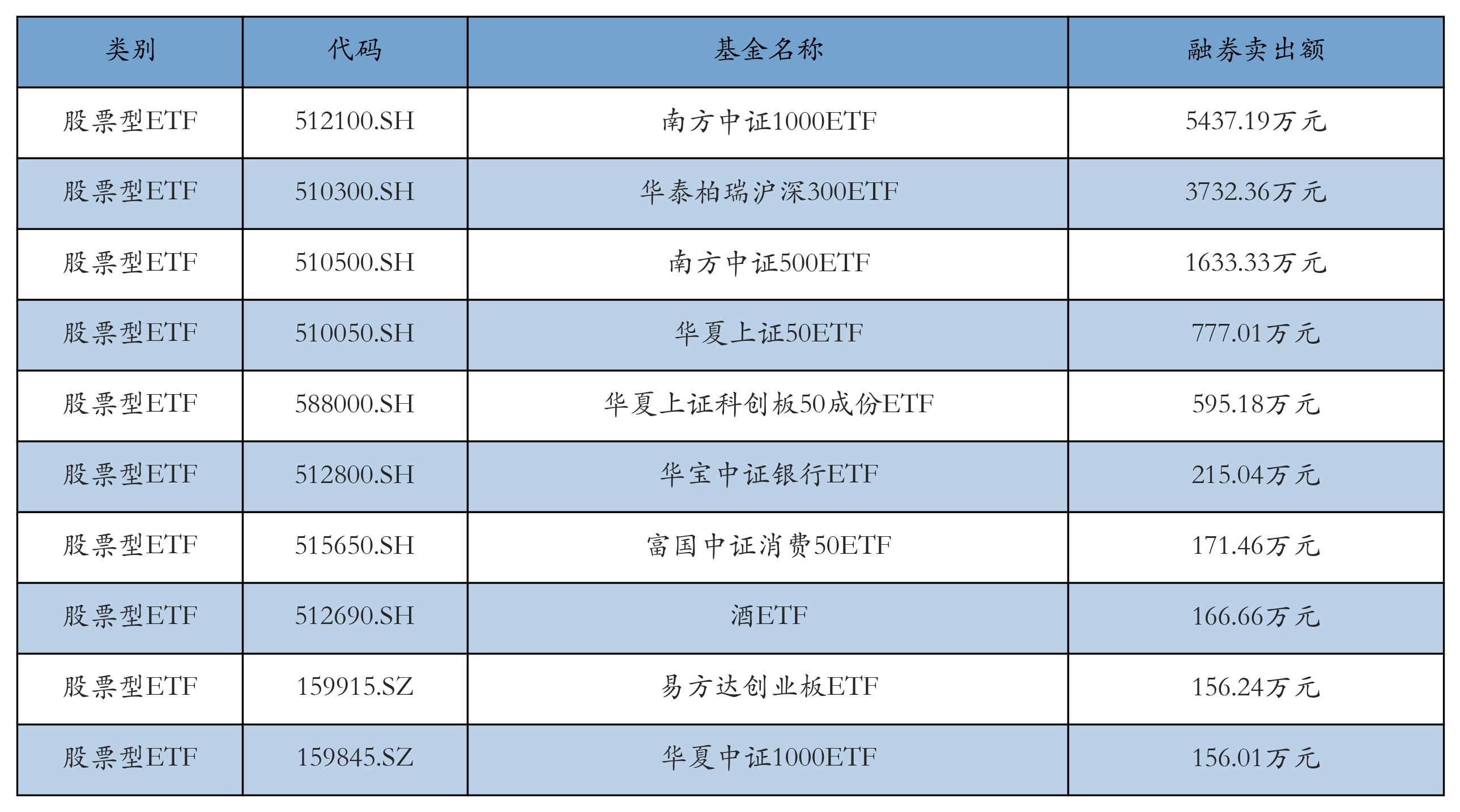 昨日股票型ETF融资卖出额最高的3只ETF及其卖出金额分别为:南方中证1000ETF(5437.19万元)、华泰柏瑞沪深300ETF(3732.36万元)、南方中证500ETF(1633.33万元)。融券卖出额前10详情见下表: