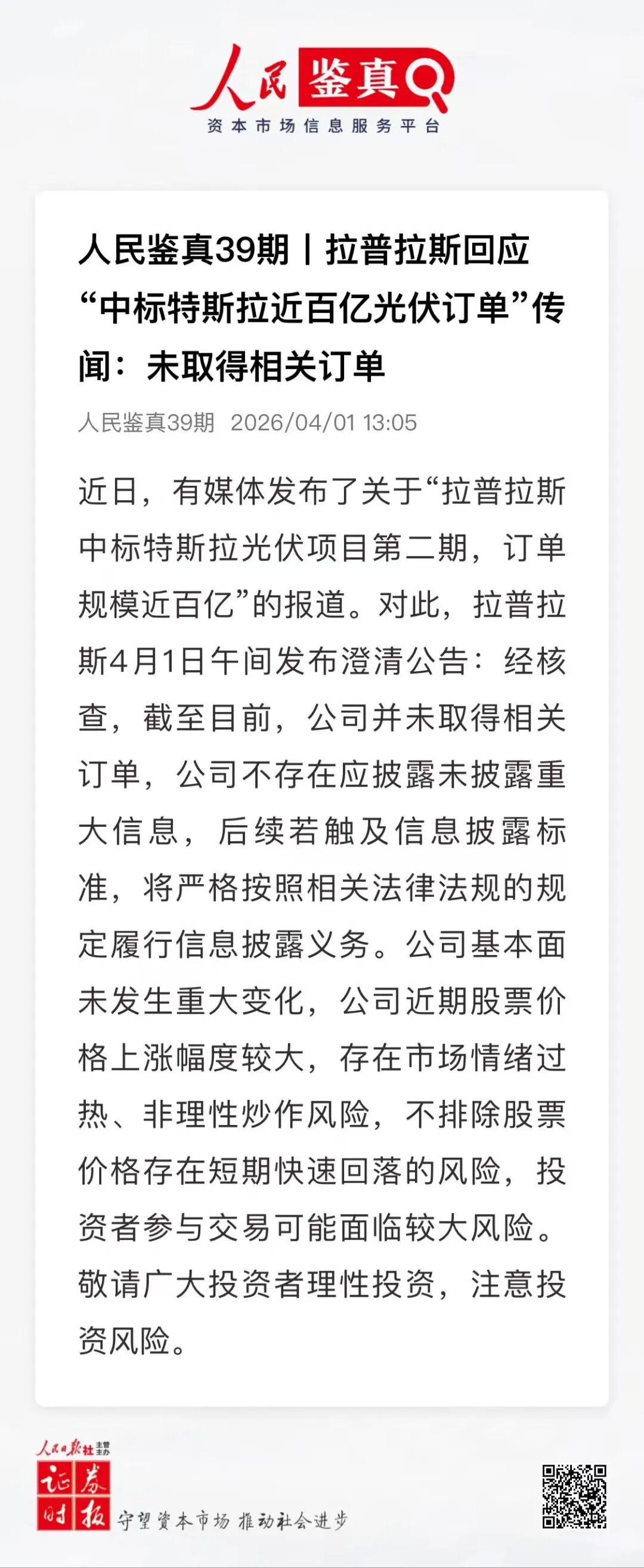 拉普拉斯(688726)4月1日午间发布澄清公告,近日,公司关注到有媒体发布了关于公司“拉普拉斯中标特斯拉光伏项目第二期,订单规模近百亿”的报道。为避免相关信息对广大投资者造成误导,公司就相关传闻事项澄清如下: