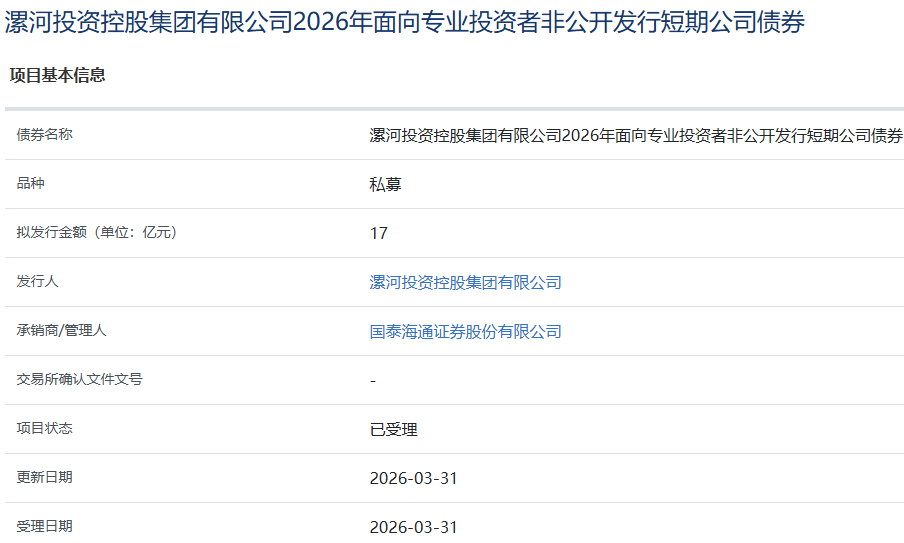 【大河财立方消息】3月31日,漯河投资控股集团有限公司2026年面向专业投资者非公开发行短期公司债券项目获上交所受理。