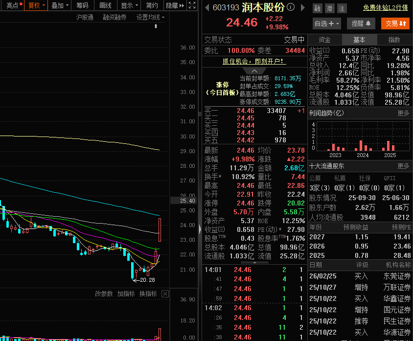 【大河财立方消息】4月1日,润本股份高开高走。截至发稿,润本股份股价涨停,封单2.68亿元。