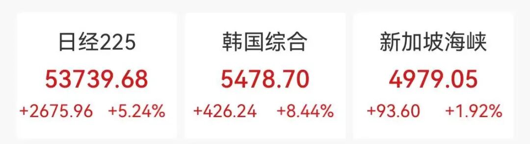 日韩股市集体爆发。Wind数据显示,截至收盘,日经225指数上涨5.24%报53739.68点,创2025年4月10日以来最大单日涨幅。