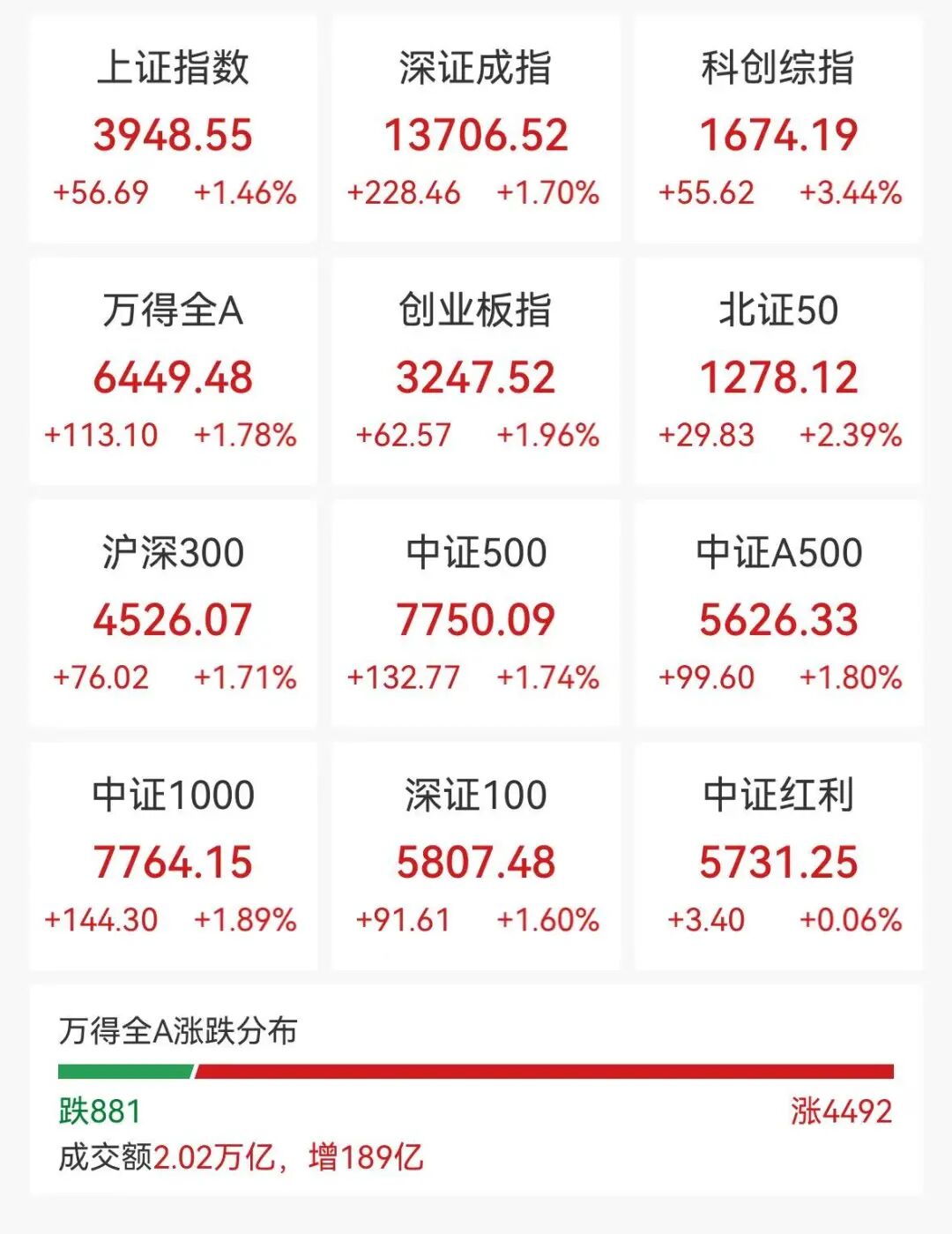 截至收盘,上证指数收涨1.46%,创业板指涨1.96%,深证成指涨1.70%,科创综指大涨3.44%。