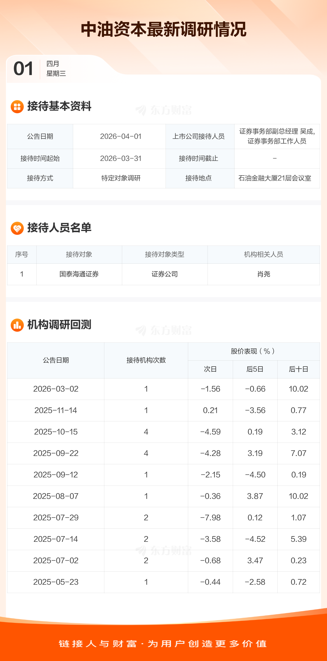 中油资本4月1日公告称,3月31日接待国泰海通证券等1家机构调研。接待人员包括证券事务部副总经理 吴成,证券事务部工作人员。