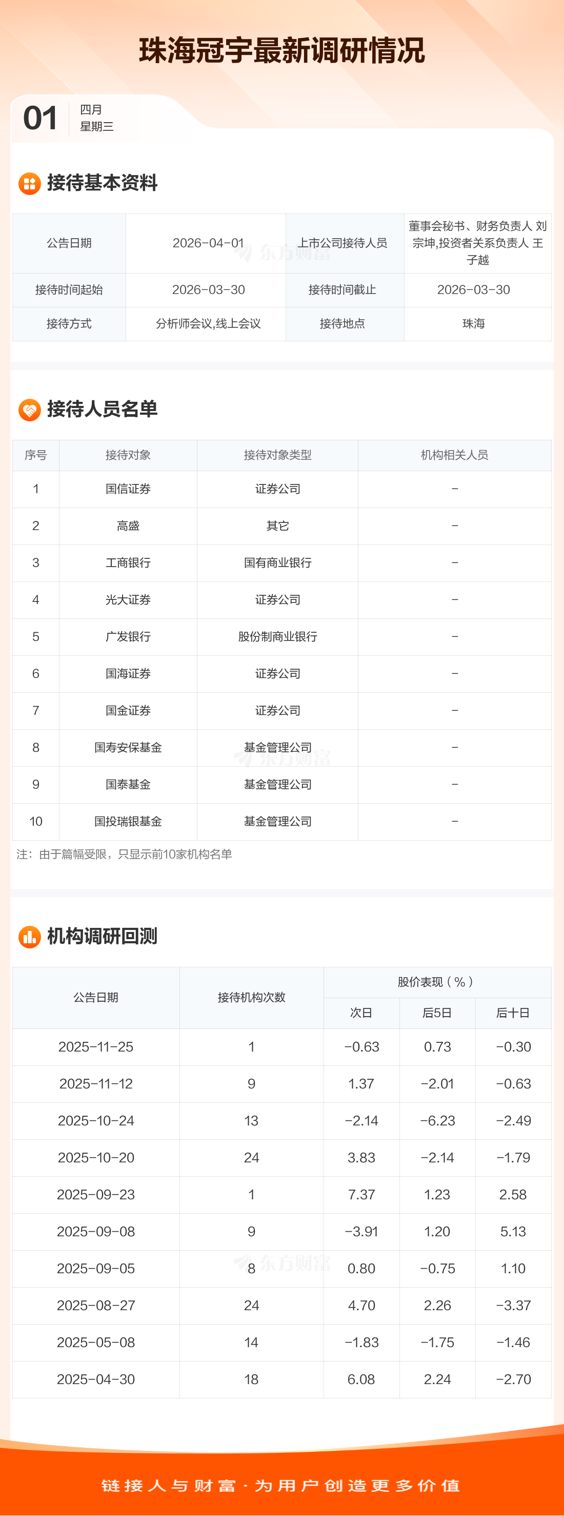 珠海冠宇4月1日公告称,3月30日接待国信证券等33家机构调研。接待人员包括董事会秘书、财务负责人 刘宗坤,投资者关系负责人 王子越。