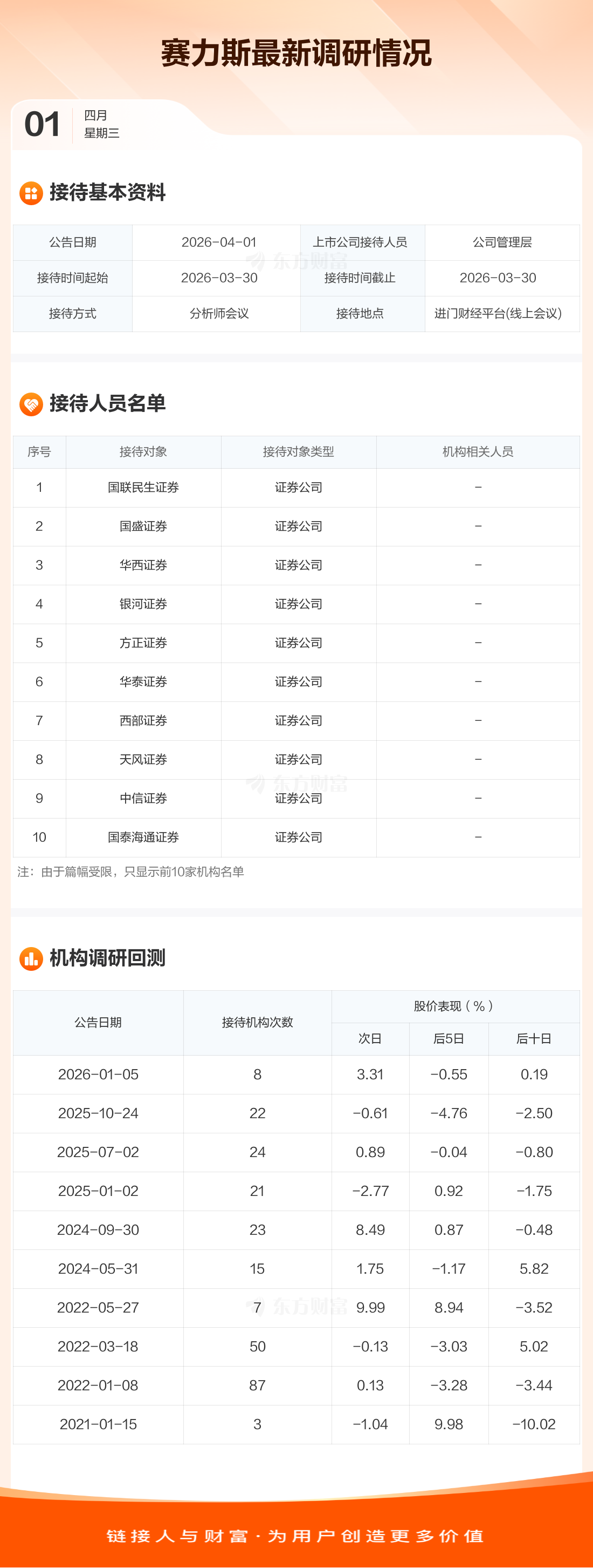 赛力斯4月1日公告称,3月30日接待国联民生证券等41家机构调研。接待人员包括公司管理层。