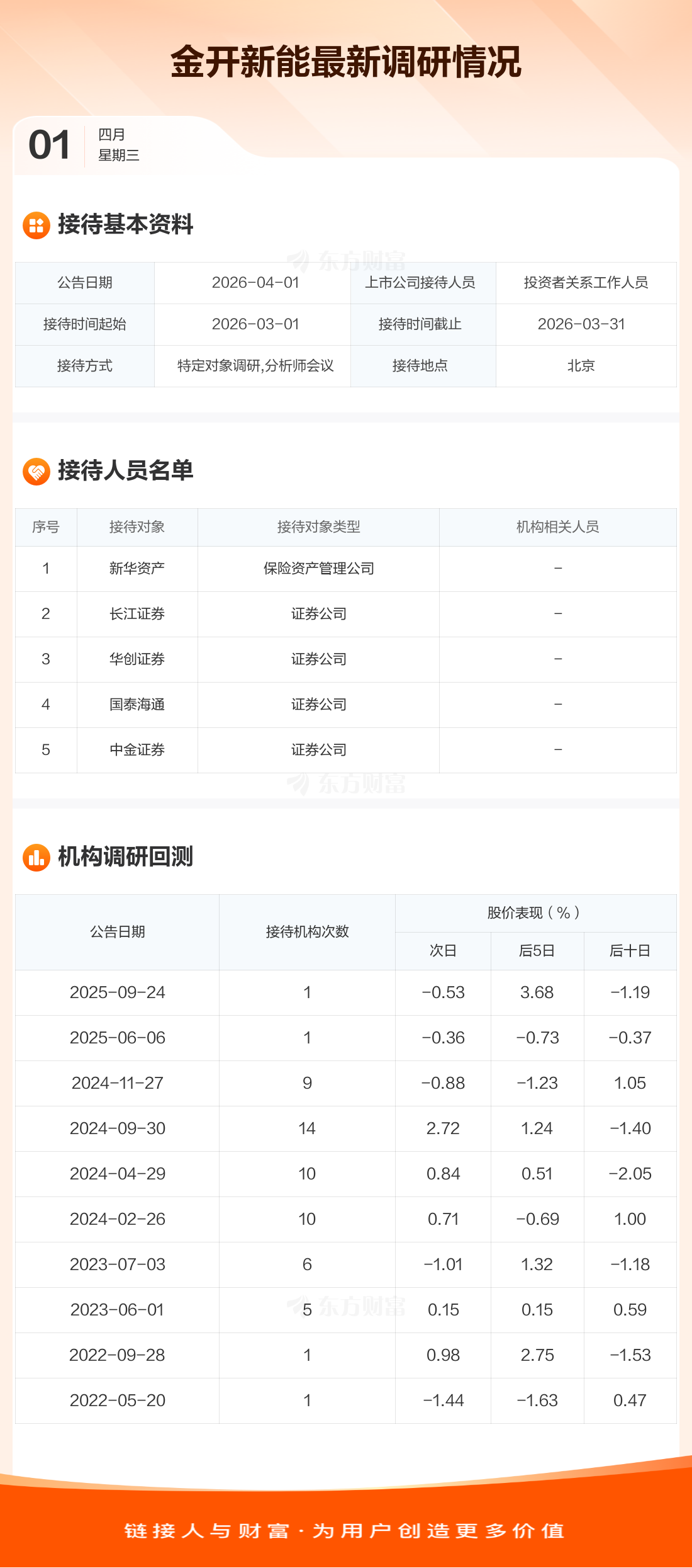 金开新能4月1日公告称,3月1日至3月31日接待新华资产等5家机构调研。接待人员包括投资者关系工作人员。