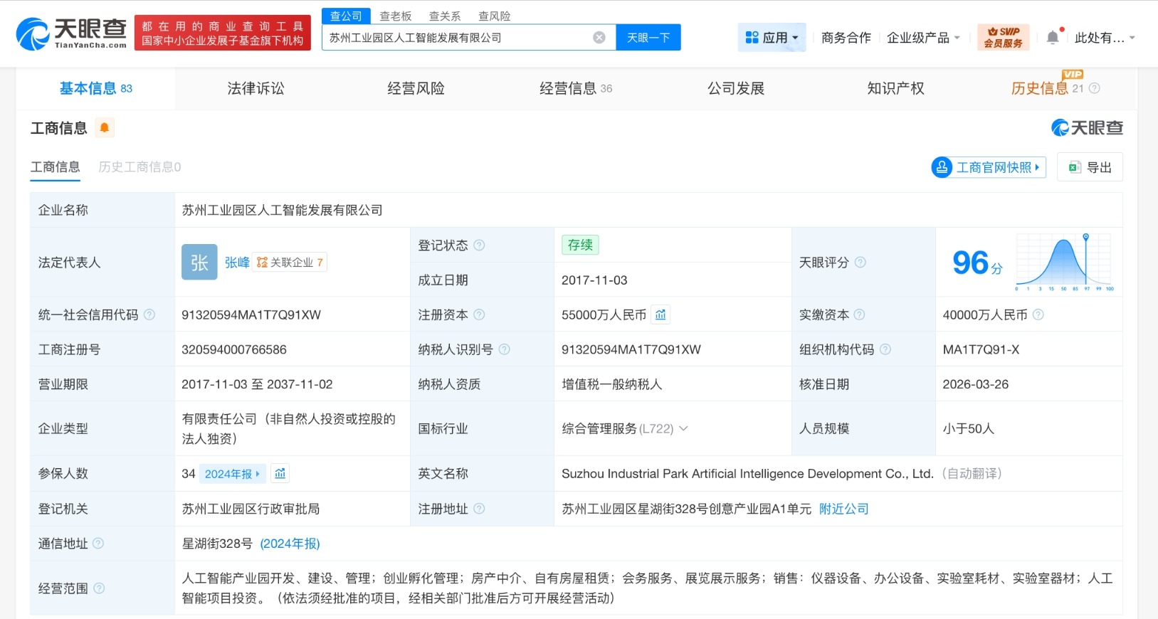 南方财经4月1日电,天眼查工商信息显示,近日,苏州工业园区人工智能发展有限公司发生工商变更,注册资本由4亿人民币增至5.5亿人民币,增幅37.5%。该公司成立于2017年11月,法定代表人为张峰,经营范围包括人工智能产业园开发、建设、管理,创业孵化管理,人工智能项目投资等。股东信息显示,该公司由苏州工业园区科技发展有限公司全资持股。