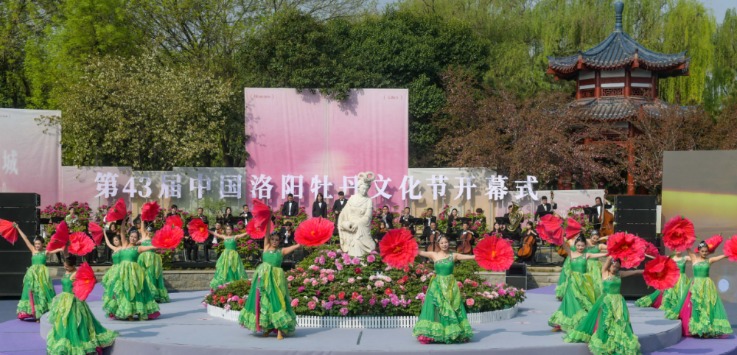开幕式在童声吟诵《诗经·鹿鸣》中拉开文化序幕。舞台诗剧以“笔墨访花”“赏花行春”“清谈访花”“花漾时代”四幕串联起跨越千年的赏花姿态:从顾恺之笔下洛神与牡丹的笔墨相逢,到刘禹锡“唯有牡丹真国色”的盛唐风华;从两宋“洛阳地脉花最宜”的文人清赏,到当下河洛大鼓与现代舞交织的花漾时代——一部生动的牡丹文化史在花间徐徐展开。