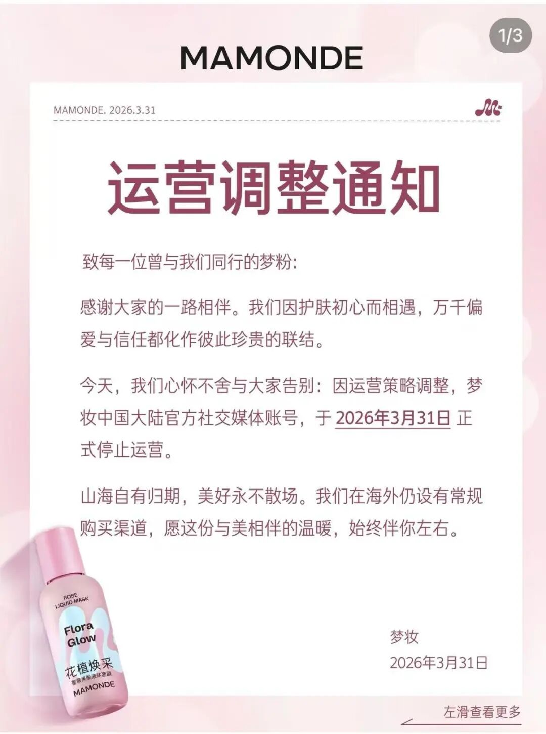 3月31日,梦妆中国官方账号发布公告称,“因运营策略调整,梦妆中国大陆官方社交媒体账号,于2026年3月31日正式停止运营。”同时,梦妆宣布,在中国的线上官方销售渠道(如官方商城、电商平台旗舰店)将服务至2026年6月30日正式关闭。此后,可以在品牌海外常规购买渠道了解梦妆产品信息。