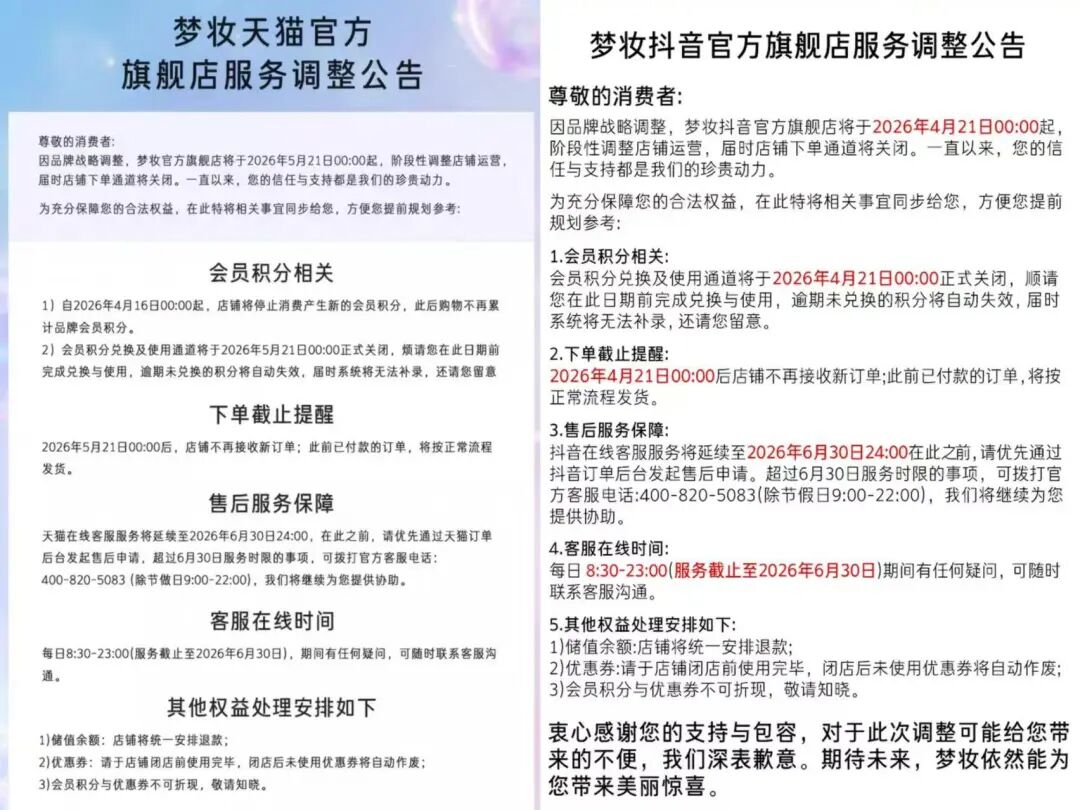 售后服务方面,梦妆天猫、抖音、拼多多官方旗舰店在线客服服务将延续至2026年6月30日24:00。京东在线客服服务将延续至2026年5月31日24:00。
