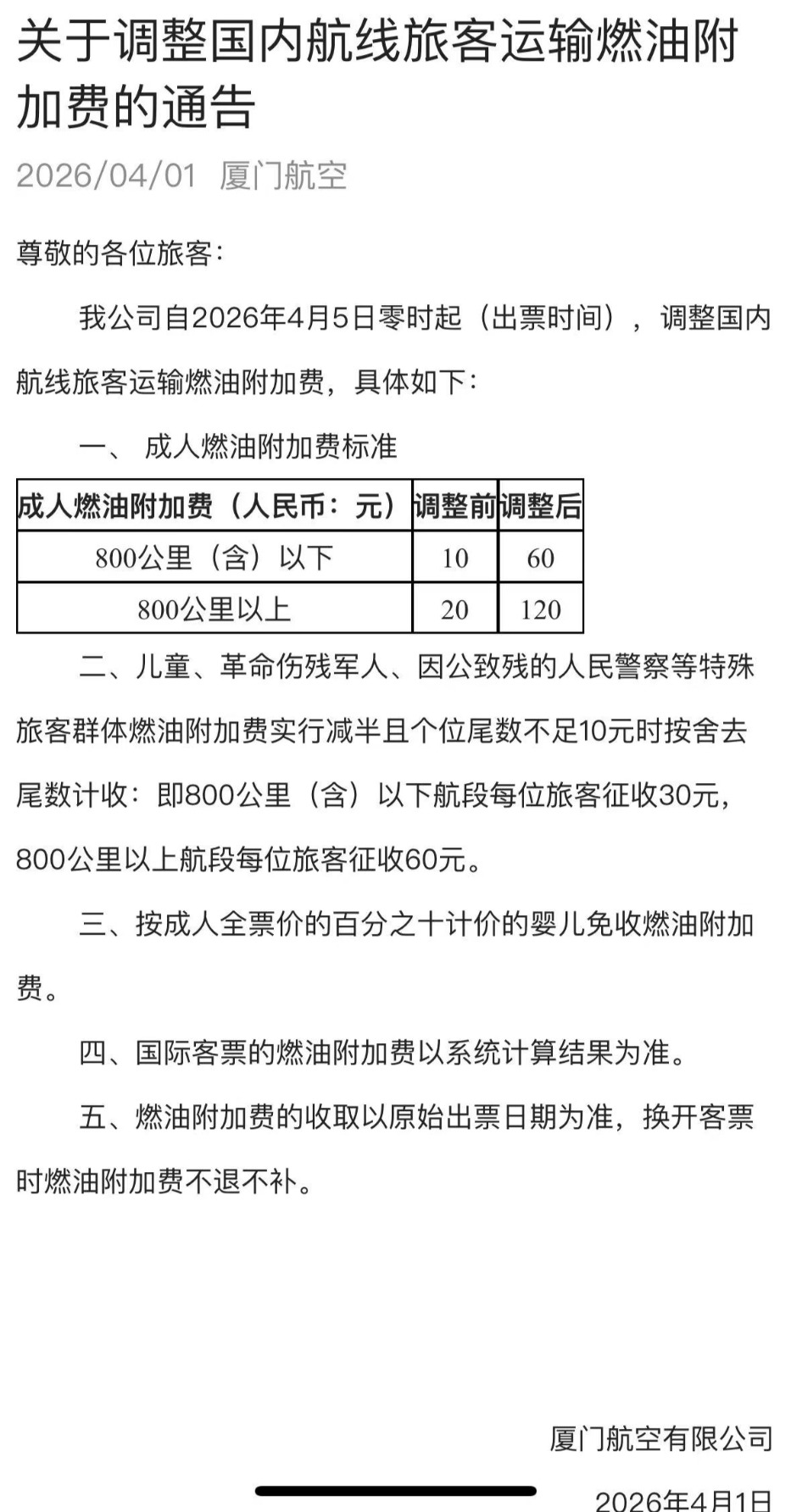 目前,800公里(含)以下航段的燃油附加费是10元,800公里以上航段是20元,意味着燃油费在4月5日后要分别上调50元和100元,涨幅达5倍。