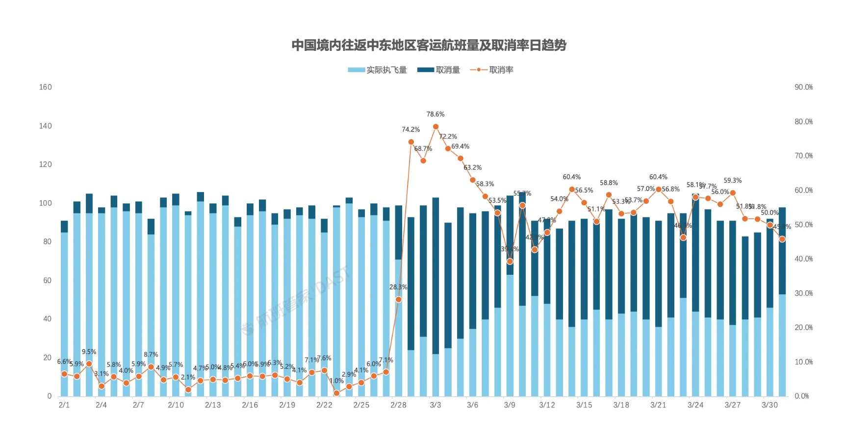 航班管家最新统计显示,截至3月31日,中国境内-中东航线仍处于低位,其中中国境内-阿联酋,卡塔尔和沙特的航班恢复率只有两成左右,主要为阿联酋航空、阿提哈德航空、卡塔尔航空以及沙特航空执飞,国内航司暂无航班。