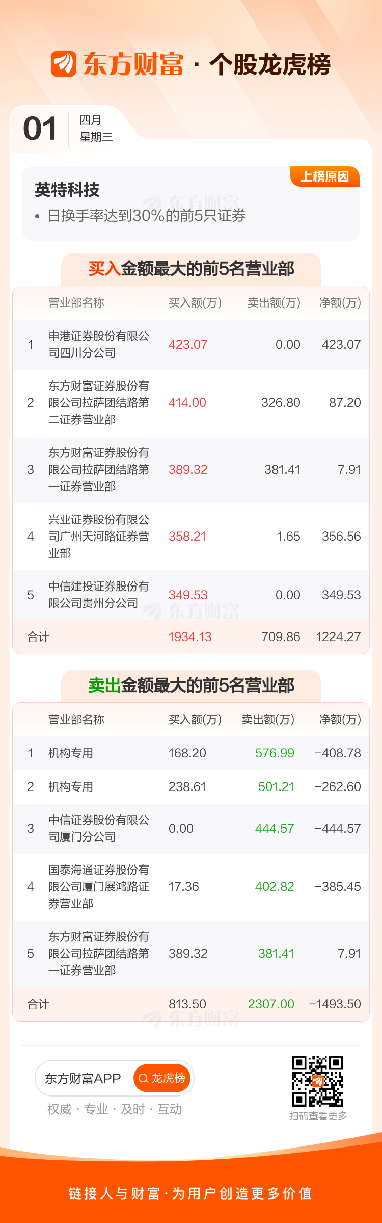 交易所2026年4月1日公布的交易公开信息显示,英特科技因成为日换手率达到30%的前5只证券上榜。英特科技当日收报24.3元,涨跌幅-2.37%,偏离值31.26%,换手率31.26%,成交额4.07亿。