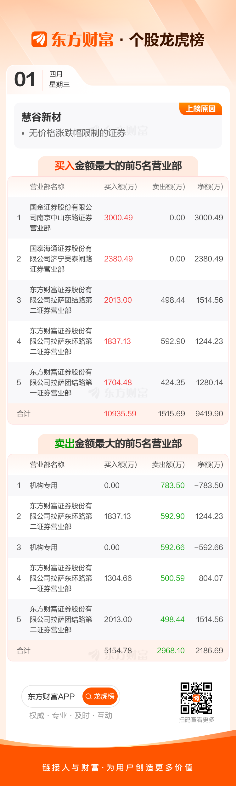 交易所2026年4月1日公布的交易公开信息显示,慧谷新材因成为无价格涨跌幅限制的证券上榜。慧谷新材当日收报126.71元,涨跌幅61.66%,换手率75.87%,成交额14.74亿。
