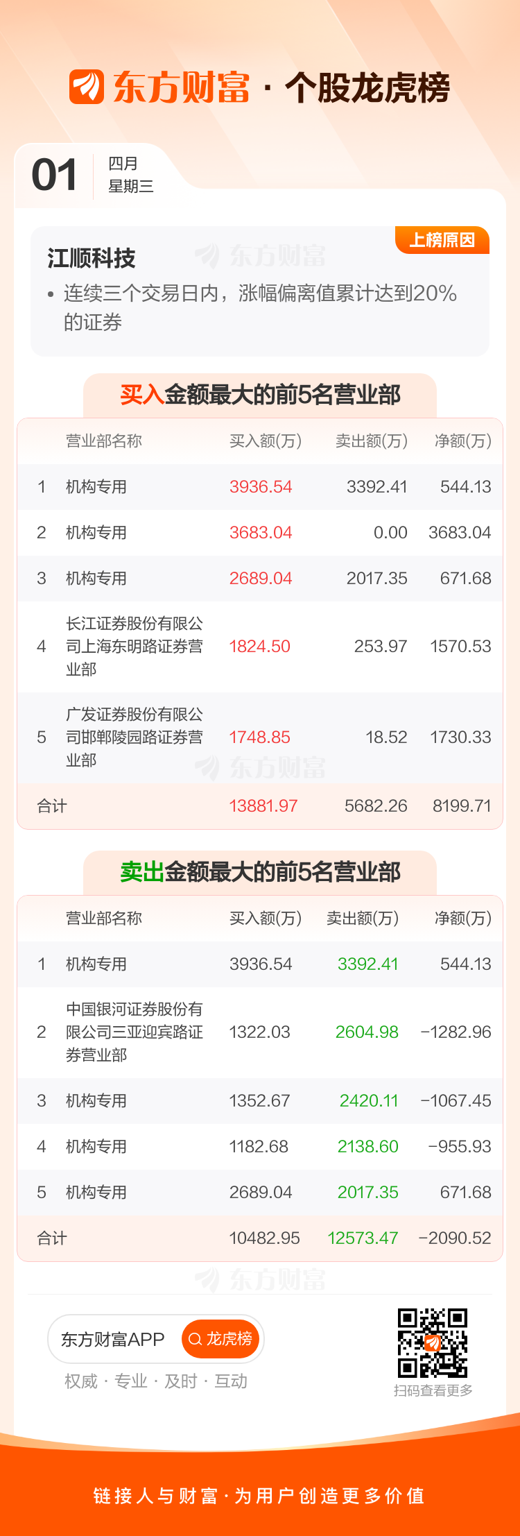 交易所2026年4月1日公布的交易公开信息显示,江顺科技因成为连续三个交易日内,涨幅偏离值累计达到20%的证券上榜。江顺科技当日收报179.97元,涨跌幅7.99%,换手率23.36%,成交额6.13亿。异常期间3月30日至4月1日,期间涨幅20.64%,累计偏离值20.73%,区间成交额17.72亿。