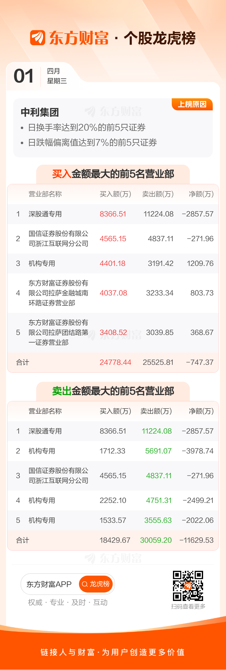 交易所2026年4月1日公布的交易公开信息显示,中利集团因成为日换手率达到20%的前5只证券、日跌幅偏离值达到7%的前5只证券上榜。中利集团当日收报4.53元,涨跌幅-8.30%,偏离值30.71%,换手率30.71%,成交额34.29亿。